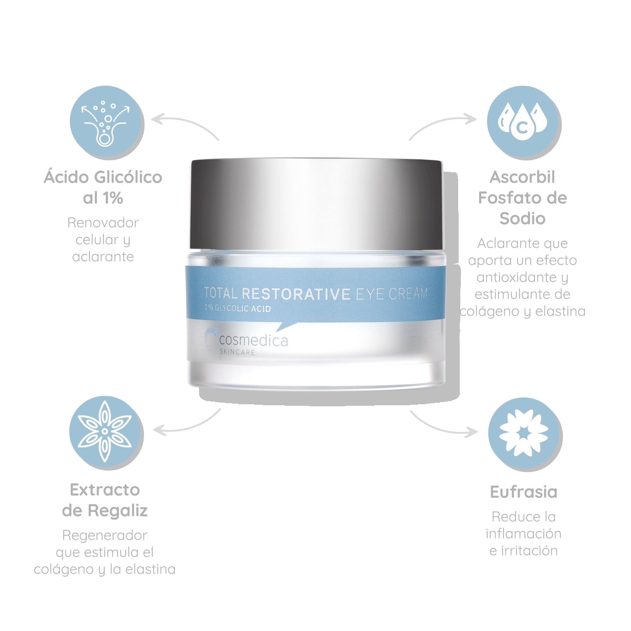 La Total Restorative Eye Cream de Cosmedica Skincare es un tratamiento especializado para el contorno de ojos, diseñado para reducir arrugas, ojeras y signos de fatiga, mientras hidrata profundamente la delicada piel de esta zona. Su fórmula avanzada combina péptidos, ácido hialurónico y antioxidantes, ayudando a mejorar la elasticidad, suavizar líneas finas y proteger contra el daño ambiental.