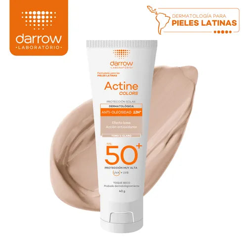 Darrow Actine COLORS FPS 50+ es un protector solar dermatológico con color que protege eficazmente la piel frente a los daños del sol, ayudando a prevenir manchas, envejecimiento prematuro y brillo excesivo. Su fórmula avanzada combina alta protección solar con una acción antioxidante gracias a la Vitamina E y un potente efecto seboabsorbente.
