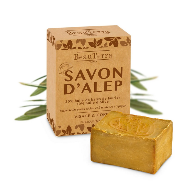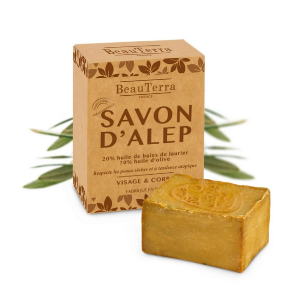El Jabón Sólido de Alepo con aceite de oliva y laurel (20% de contenido) brinda a tu piel propiedades calmantes y desinfectantes. Auténtico y natural, el Jabón de Alepo es muy suave, respetuoso con la piel y el medio ambiente (fácilmente biodegradable). Para pieles sensibles, irritadas, dañadas o muy secas.